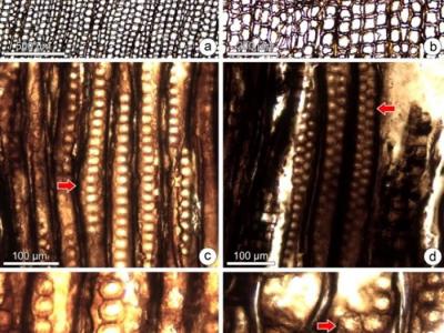 浙江早白垩世松柏类木化石“周氏短木”的生长轮、径切面纹孔等解剖构造浙江早白垩世...