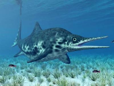 鱼龙是一种生活在恐龙时代的海洋爬行动物,现早已灭绝消失,它看上去像凶猛的巨型海...