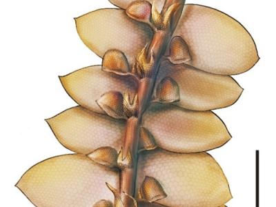 深裂耳叶苔重建图(杨定华绘)缅甸克钦邦白垩纪琥珀中的深裂耳叶苔。绿色箭头指示腹...