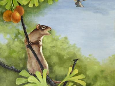 热河俊兽生态复原图 (许勇 供图)热河俊兽正型标本(右下角)与一件北票鲟标本保存...