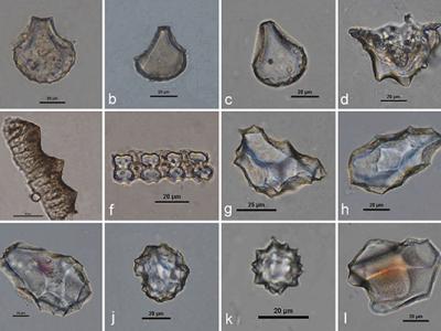 茶岭遗址常见植硅体类型(a-f:水稻植硅体)茶岭遗址若干单位出...