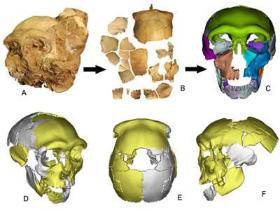 图1. 安徽东至华龙洞出土的人类头骨化石。A:头骨化石出土状况...