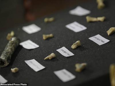 一块哺乳动物头骨化石,牙齿窝里的沉积物,原来是史前蜜蜂筑的巢穴。图片来源:拉萨...