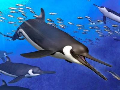 新发现的“中岛肯氏海豚”复原想像图。现存在博物馆中的“中岛...