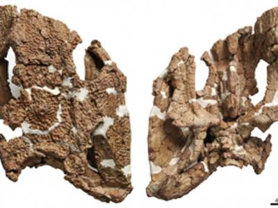 石油似卡玛螈头骨及复原图(刘俊 供图)(化石网报道)据中国...