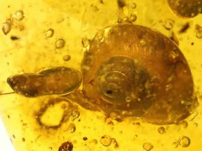 缅甸琥珀中带触角等软组织的蜗牛缅甸琥珀中带触角等软组织的蜗...