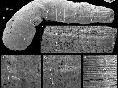 寒武纪早期宽川铺组Eopriapulites狮身人面像的管状不完整标本,显示了它们的腹神经...