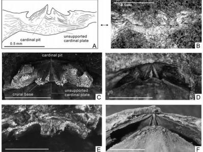 Thulatrypa两个种关键特征的比较,ABEF为Thulatrypa gregaria,CD为Thulatrypa o...