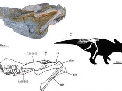 图1:诸城坐角龙正型标本侧视(A、B)及复原图(C) (贺一鸣供图) 图2:诸城坐...