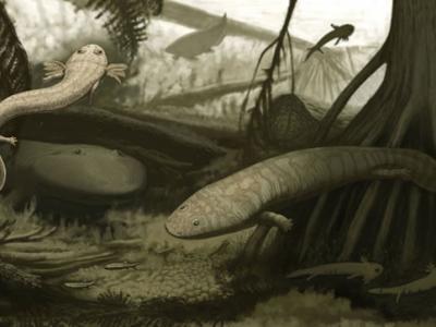 图像再现古代湖泊生态系统中灭绝的两栖动物新物种Timonya anneae(左)和Procuhy...