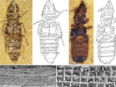早白垩世巨须隐翅虫(上)和腹部节间膜“砖墙构造”(下) 现生巨须隐翅虫代表...