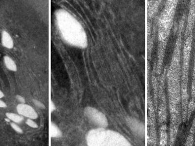 海南岛始新世的莲叶化石中的叶绿体(左)保存着包括基粒片层结构和淀粉粒的超微结...