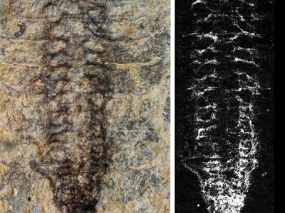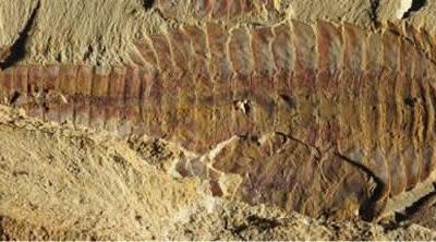 澄江动物化石群中节肢动物抚仙湖虫的背视,显示完整的心血管循环系统。 澄江动...