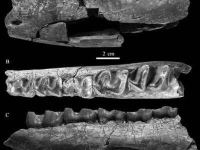 杨氏广南犀(新属新种)左下颌骨,A 颊侧视,B 冠面视,C 舌侧视。(王海冰供图)...