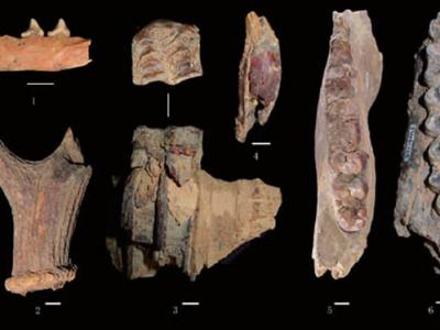凤凰山地点发现的典型化石标本。1. 似鸡骨山狐下颌残段;2. 葛氏斑鹿角残段;3. ...