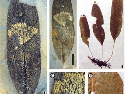 化石和现代星蕨. A–C, Palaeosorum ellipticum F. M. B. Jacques & Z. K. Z...