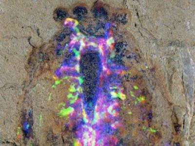 这是Alalcomenaeus化石标本头部的特写,显微镜技术叠加色彩揭示该化石标本化学元...