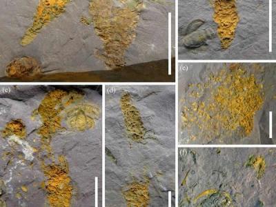 辽宁大连寒武纪始海百合化石。比例尺为1厘米 寒武纪棘皮动物特别是始海百合类近...