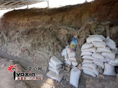 新发现的国内最大侏罗纪恐龙骨骼化石。堆积的沙袋,是防止坍塌采取的保护措施。 ...