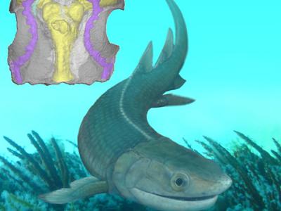 奇异东生鱼复原图及脑颅三维虚拟复原图 生物进化史上,从鱼类到早期两栖类动物的...