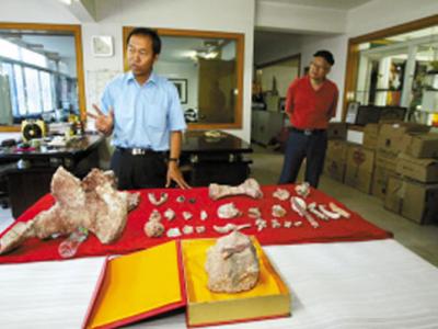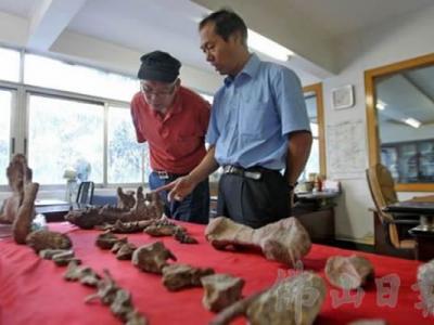 李伟民的办公室里摆放着三水盆地最近发现一批动物化石 三水盆地最近发现的保存...