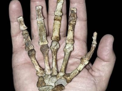 放在现代人手掌里的一个南方古猿源泉种的右手骨骼化石 拥有长长的胳膊,但是髋...