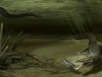 远古鳄鱼复原图 据英国媒体9月15日报道,哥伦比亚最大的露天煤矿日前发掘出一具...