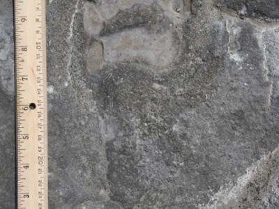 可能是蹄兔的对接拖拽痕迹;中心右侧的特征被解释为可能是粪石(粪便化石)。 (图片...