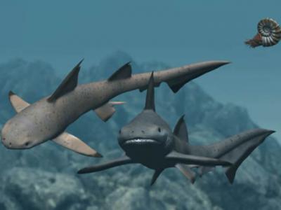 弓鲨的可能模样 嵌有鲨鱼牙齿的菊石壳化石 菊石壳化石上内嵌的弓鲨牙齿特写...