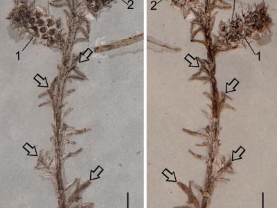 正反面保存的模式标本,可见其和松柏类一样的叶和“球果”侧生器官中的种子(s)及近...