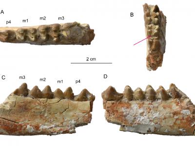 一块哺乳动物头骨化石,牙齿窝里的沉积物,原来是史前蜜蜂筑的巢穴。图片来源:拉萨...