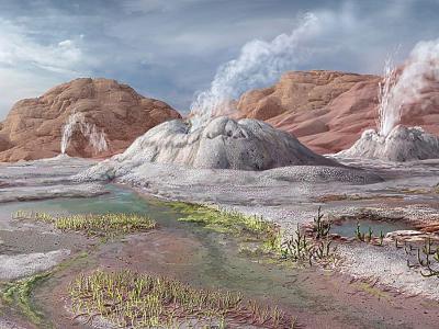 泥盆纪早期Rhynie硅质岩的艺术再现。署名:维克托·奥·莱谢克(化石网cnfossil.com...