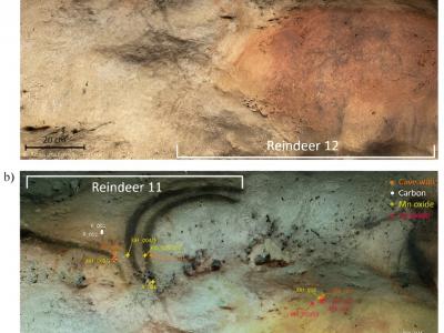 (a)从Font-de-Gaume cave的正面驯鹿11和12对“Carrefour”的选定面板进行可见光摄影...