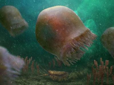 一群游弋在寒武纪海洋中的Burgessomedusa phasmiformis的艺术再现(克里斯蒂安·麦...