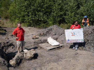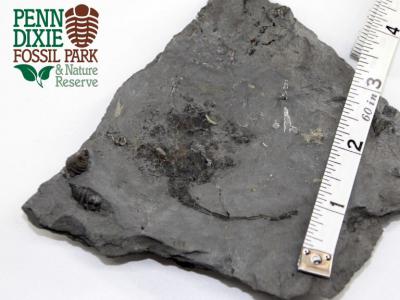 詹姆斯·汉纳于2023年4月在宾州迪克西发现的海果核类化石。左边是两个角珊瑚。信用...