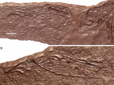 新发现的兽脚类恐龙Migmanychion Laiyang有奇怪的手。鸣谢:白垩纪研究(2023)。DOI:...