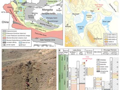 新三叶虫组合产地的位置及地质背景。1-2 湖区构造带及Seer剖面的位置; 3 三叶虫产出...
