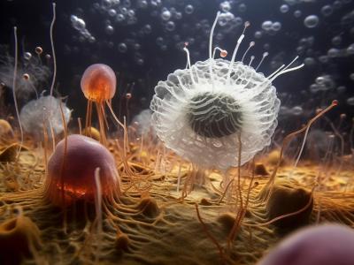 艺术家想象的居住在海底细菌垫上的“原甾醇生物群”的原始真核生物集合体。根据分子...