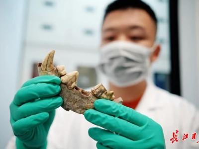 胡家铭展示斑鬣狗化石。长江日报记者何晓刚 摄吉林通化大安溶洞古虎化石(化石网报...