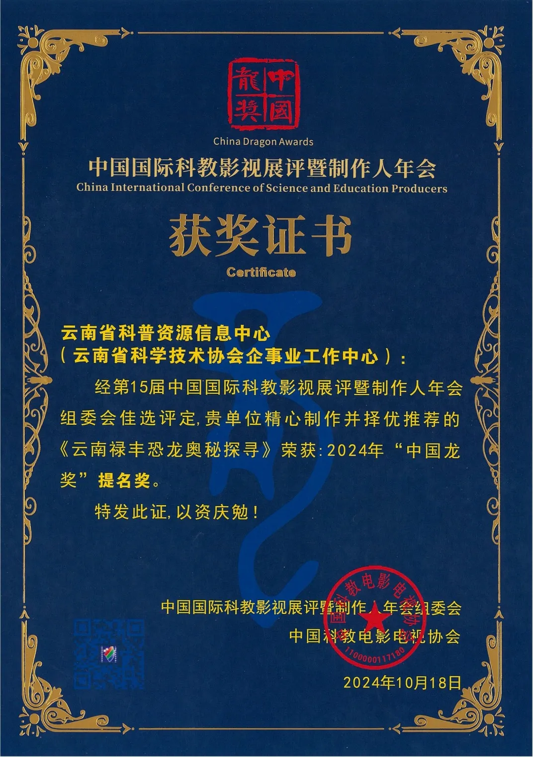 《云南禄丰恐龙奥秘探寻》荣获2024年“中国龙奖”提名奖(化石网cnfossil.com)据云...