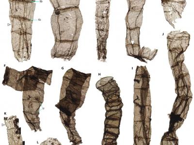 串岭沟组中发现的壮丽青山藻。化石保存为有机质壁构成的多细胞丝状体,显示细胞大小...