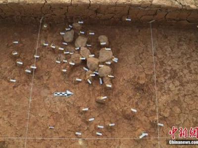 资料图:2021年3月24日在夜塬遗址拍摄的石制品密集分布状况。中新社发 陕西省考古研...