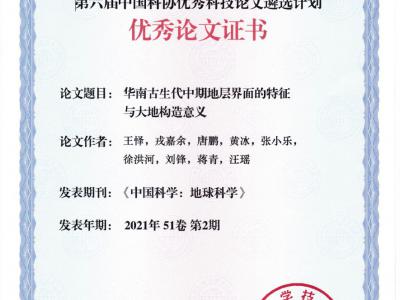 王怿等《华南古生代中期地层界面的特征与大地构造意义》论文获第六届中国科协优秀科...
