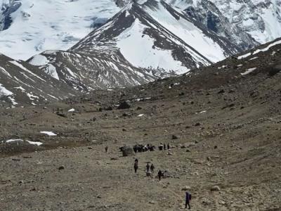 科考队上山 黄健摄位于海拔5800米的含高山栎化石的地层剖面 胡珉琦摄四人合照 阿旺...
