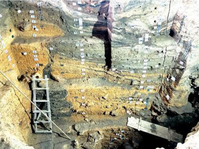 招果洞遗址发掘地层,成人墓在第九层发现。招果洞发现的成人墓。成人墓发现的右尺骨...