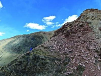 袁东勋在文布乡北村一处剖面采集牙形化石,这是此行科考中坡度最陡的一座山。琚琦在...