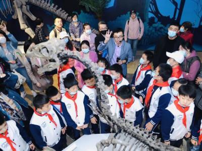白垩纪国家地质公园古生物化石博物馆内,庞大的恐龙化石骨架高高屹立,向来自全国各...