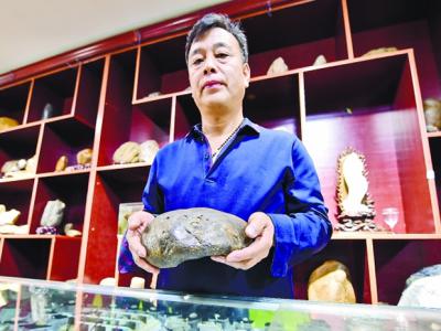海伦市奇石协会的工作人员展示在海伦发现的化石(化石网报道)据新华社哈尔滨10月3...