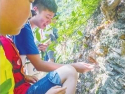 孩子们认真观察山体裸露的岩层(记者 刘帅 摄)(化石网报道)据武汉晨报(见习记者...