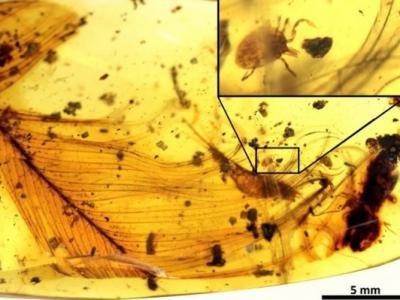 资料图:缅甸产琥珀中发现蜱虫寄生在恐龙(中国化石网报道)据...